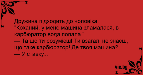 Карбуратор Water in the Carburetor Anruf in der Autowerkstatt Wasser im Vergaser Καρμπυρατέρ Περί γυναικών Жена притеснява по телефона мъжа си: Жена към мъжа си: — Любий, мені здається вода потрапила в карбюратор. — Ой, які ми розумні стали… На автах розуміємося. А ти хоч знаєш, де той карбюратор стоїть? — У машині… — А машина де? — У річці… A mulher liga toda esbaforida para o marido no escritório: — Querido, o carro não quer pegar... está com água no carburador. — Você já chamou um mecânico? — Não! — Então como é que sabe que o... Little Johnny runs to his dad and says, "Dad, there's water in the carburetor of the car!" "How can you be so sure?" the father asks. "I just know there is," replies Little Johnny. "Do... Mi esposa me dijo que el auto no estaba corriendo bien, que había agua en el carburador. Cuando pregunté donde estaba el auto ella me dijo: En el lago. Kona på 74 kom hjem til mannen sin og sa: – Kjære, bilen vil ikke starte, men jeg vet hva som er problemet. – Jaha, sa mannen tvilende. Og hva er problemet? – Det er vann i forgasseren, sa kona. –... Había una vez una señora que llama a su esposo y le dice: Cariñito, tuve problemas con el carro. Y el esposo le dice: ¿El carro? ¿Qué pasó? Nada, que creo que le entró agua en el carburador y por... Een vrouw komt op een middag thuis en zegt tegen haar man: "Schatje, de auto start niet meer, maar ik weet wat het probleem is" "Wat dan?" vraagt haar man. De vrouw antwoordt: "Er zit water in de... Une femme rentre chez elle après avoir fait les magasins. Son mari regarde le foot à la télé. - Chéri, dit-elle, il y a un problème avec la voiture. Elle ne démarre plus. - Un problème ? Avec ma... Телефонує блондинка чоловікові й каже: — Дорогенький, здається в карбюратор моєї машини потрапила вода. — Як вона... а ти взагалі знаєш що таке карбюратор? — здивоване запитує чоловік. — А де... Vaimo soittaa miehelleen: - Auton kaasuttimessa on vettä ja se ei oikein käynnisty. - Missä auto nyt on? - Järvessä. Wife: "There's trouble with car. It has water in the carburetor." Husband: "Water in a carburetor? That's ridiculous." Wife: "I tell you the cas has water in the carburetor." Husband: "You don't... Mergina skambina vyrui. - Brangusis į mano mašinos karbiuratorių vandens pribėgo. - Oho tu dar, net ir tokį žinai. Kur jis yra ar bent žinai? - Na dabar tai ežere... A esposa chega bêbada, doidona, e quase caindo em casa e diz pro marido: — Amor, ic... entrou água no carburador do nosso carro... E o cara diz: — Mas, como se você sabe, se você não entende nada... Kovácsné ziláltan ront be a lakásajtón: - Gyere gyorsan Józsi! Valami baj van a kocsinkkal. Víz került a karburátorba. - Na, ne már! Hogy kerülhetett víz a karburátorba? Hol van az autó? - A Dunában?! - Драги, мислам дека карбураторот се наполни со вода. - Знаеш ли ти воопшто каде се наоѓа карбураторот? - Па знам драги, во автомобилот. - А каде е автомобилот? - Ене го во езерото. Dans une famille de mécaniciens, Toto, le tout jeune fils de 12 ans vient de faire son premier tour en voiture tout seul…. Et il revient sans la voiture. - Qu’est-ce qui se passe Toto ? - Je crois... Ao marido de Maria (Zé)chegar em casa, Maria diz : — Zéééééé ,o carro ta cum água no carburador!!! — Se nem sabe o que é carburador!!! - diz o Zé -Cade o carro??? — Vem vê!!! - diz a Maria... Ea: - "Draga, s-a Defectat masina. Cred ca are apa in Carburator." El: - "E ridicol! Tu nici Macar nu stii ce e ala carburator. Unde e Masina?" Ea: - "Pai in Piscina... O blondă vine la soţul ei: - Dragă, s-a stricat maşina! Are apă în carburator! - Iubito, tu nici nu ştii ce e ăla carburator. De unde ştii că are apă în carburator? Lasă că verific eu. Unde e... Manželka takhle jednou přijede z práce domů a povídá manželovi: "Drahý, v karburátoru je voda." "Voda v karburátoru? To je divný." "Opravdu, v karburátoru je voda." "Prosím tě, vždyť ty ani pořádně... - Brangusis, man atrodo, kad į karbiuratorių vanduo pateko… - Oi oi oi, kokia protinga, iš kur tokių frazių protingų prisirinkai? Tu bent žinai kur yra karbiuratorius? - Automobilyje… - O...