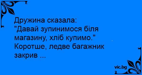 "Давай зупинимося біля магазину, хліб купимо." Коротше, ледве багажник закрив ...