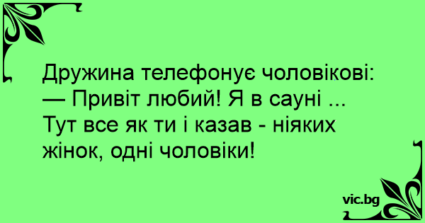 — Привіт любий! Я в сауні ... Тут все як ти і казав - ніяких жінок, одні чоловіки!