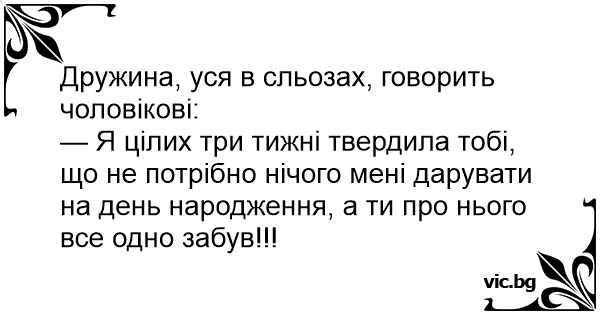 — Я цілих три тижні твердила тобі, що не потрібно нічого мені дарувати на день народження, а ти про нього все одно забув!!!