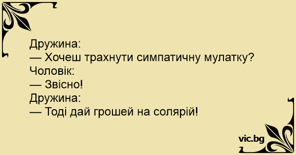 - Коля, а ты хотел-бы трахнуть симпатичную, сисястую негритоску? - Галя, ты что серъезно?! - Вполне! - Конечно хочу! - Тогда давай деньги на солярий!