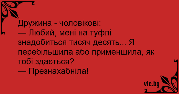 — Любий, мені на туфлі знадобиться тисяч десять... Я перебільшила або применшила, як тобі здається?