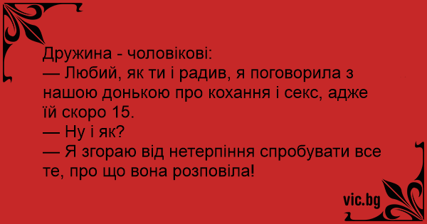 — Любий, як ти і радив, я поговорила з нашою донькою про кохання і cekc, адже їй скоро 15.