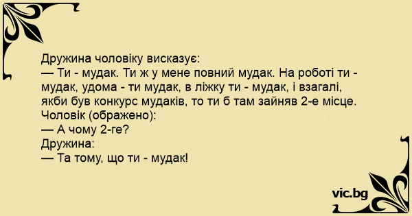 — Ти - mудak. Ти ж у мене повний mудak. На роботі ти - mудak, удома - ти mудak, в ліжку ти - mудak, і взагалі, якби був конкурс мудаків, то ти б там зайняв 2-е місце.
