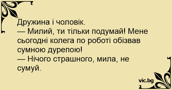 — Милий, ти тільки подумай! Мене сьогодні колега по роботі обізвав сумною дурепою!