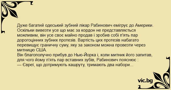 — Розумієте, дуже релігійні євреї тримають ще окремий посуд для м'ясного і молочного спеціально для Песаха. Я ж так релігійний, що для цього тримаю окрему пару зубів !
