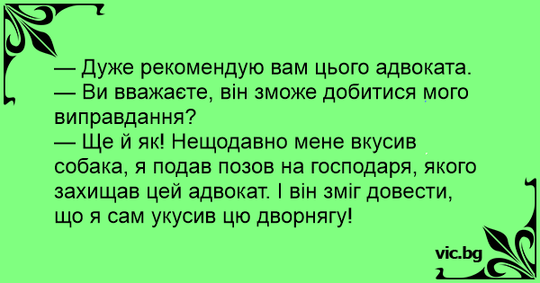 — Ще й як! Нещодавно мене вкусив собака, я подав позов на господаря, якого захищав цей адвокат. І він зміг довести, що я сам укусив цю дворнягу!