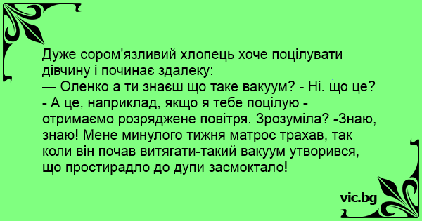 — Оленко а ти знаєш що таке вакуум? - Ні. що це? - А це, наприклад, якщо я тебе поцілую - отримаємо розряджене повітря. Зрозуміла? -Знаю, знаю! Мене минулого тижня матрос трахав, так коли він почав витягати-такий вакуум утворився, що простирадло до дупи засмоктало!