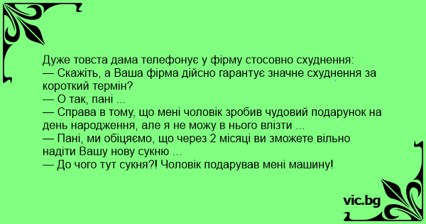 — Справа в тому, що мені чоловік зробив чудовий подарунок на день народження, але я не можу в нього влізти ...