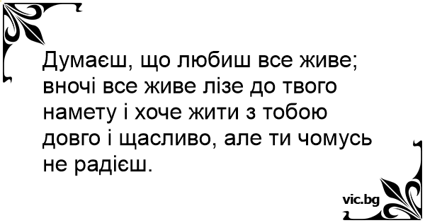 Думаєш, що любиш все живе; вночі все живе лізе до твого намету і хоче жити з тобою довго і щасливо, але ти чомусь не радієш.