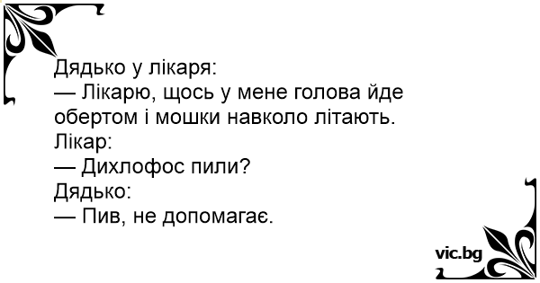 — Лікарю, щось у мене голова йде обертом і мошки навколо літають.