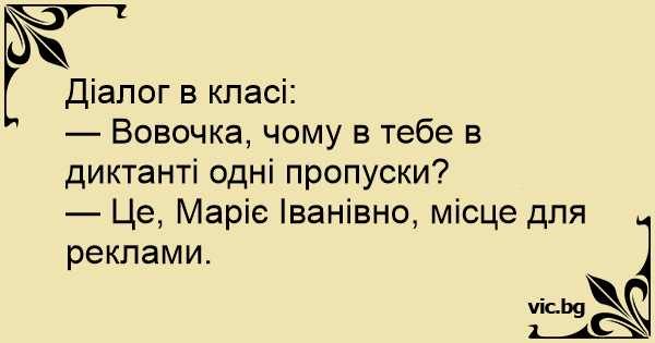 — Вовочка, чому в тебе в диктанті одні пропуски?