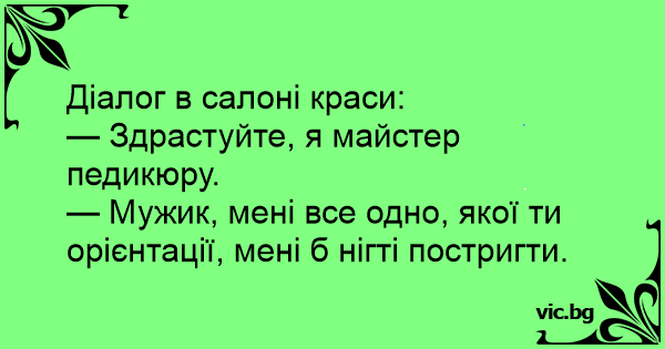 — Мужик, мені все одно, якої ти орієнтації, мені б нігті постригти.
