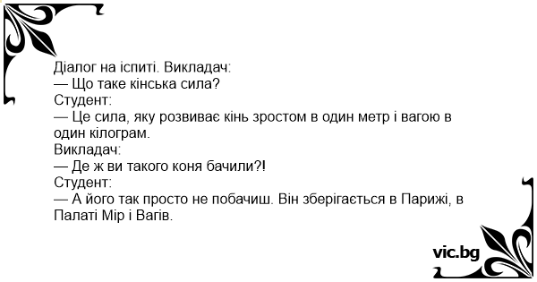— Це сила, яку розвиває кінь зростом в один метр і вагою в один кілограм.