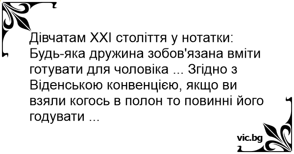 Дівчатам ХХI століття у нотатки: Будь-яка дружина зобов'язана вміти готувати для чоловіка ... Згідно з Віденською конвенцією, якщо ви взяли когось в полон то повинні його годувати ...