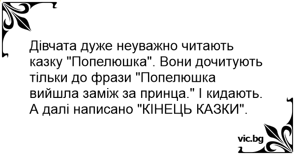 Дівчата дуже неуважно читають казку "Попелюшка". Вони дочитують тільки до фрази "Попелюшка вийшла заміж за принца." І кидають. А далі написано "КІНЕЦЬ КАЗКИ".