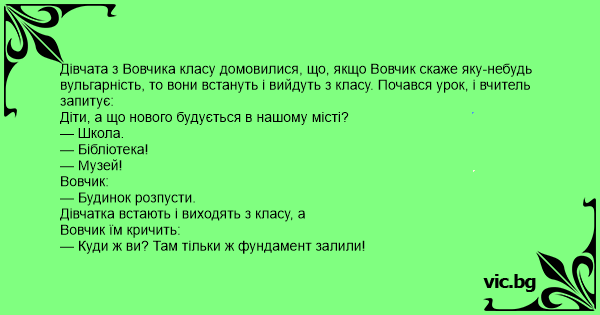 Дівчата з Вовчика класу домовилися, що, якщо Вовчик скаже яку-небудь вульгарність, то вони встануть і вийдуть з класу. Почався урок, і вчитель запитує: