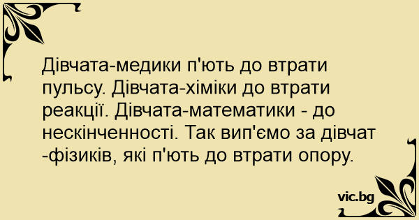 Дівчата-медики п'ють до втрати пульсу. Дівчата-хіміки до втрати реакції. Дівчата-математики - до нескінченності. Так вип'ємо за дівчат-фізиків, які п'ють до втрати опору.