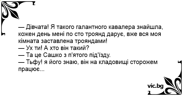 — Дівчата! Я такого галантного кавалера знайшла, кожен день мені по сто троянд дарує, вже вся моя кімната заставлена трояндами!