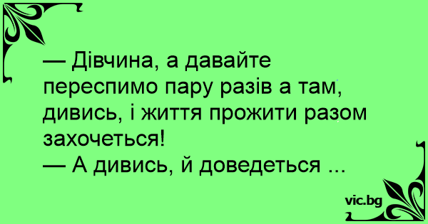 — Дівчина, а давайте переспимо пару разів а там, дивись, і життя прожити разом захочеться!