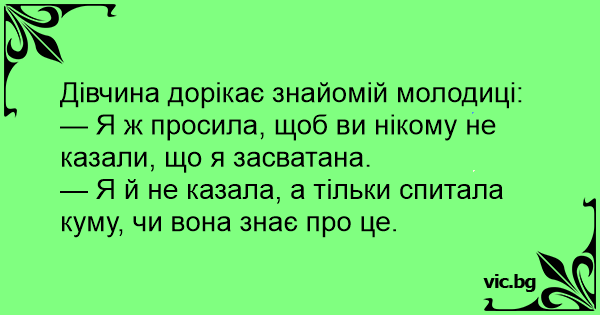 Български English Deutsch Español Русский Français Italiano Ελληνικά Македонски Türkçe Дівчина дорікає знайомій молодиці: — Я ж просила, щоб ви нікому не казали, що я засватана. — Я й не казала, а тільки спитала куму, чи вона знає про це. Português Polski Svenska Nederlands Dansk Norsk Suomi Magyar Româna Čeština Lietuvių Latviešu Hrvatski