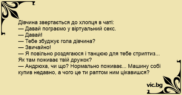 — Я повільно роздягаюся і танцюю для тебе стриптиз... Як там поживає твій дружок?