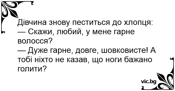 — Дуже гарне, довге, шовковисте! А тобі ніхто не казав, що ноги бажано голити?