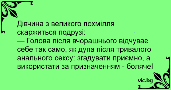 — Голова після вчорашнього відчуває себе так само, як дупа після тривалого анального сексу: згадувати приємно, а використати за призначенням - боляче!