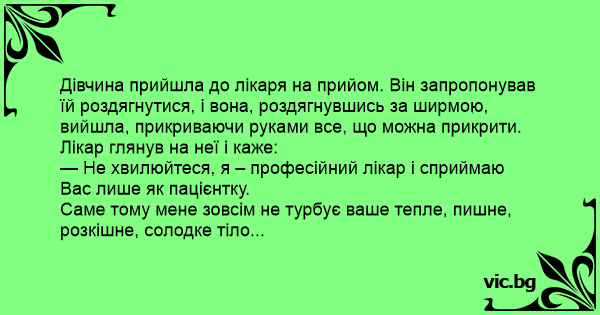 — Не хвилюйтеся, я – професійний лікар і сприймаю Вас лише як пацієнтку.