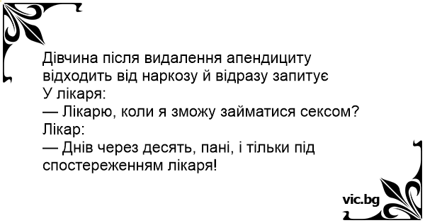 Блондинка след операция на апендесита излиза от упойката и веднага пита доктора: - Докторе, а кога ще мога да правя секс? Доктора: - След десетина дена, госпожице, и само под лекарско наблюдение!