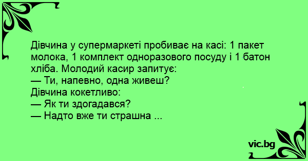 Дівчина у супермаркеті пробиває на касі: 1 пакет молока, 1 комплект одноразового посуду і 1 батон хліба. Молодий касир запитує: