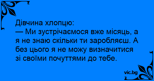 — Ми зустрічаємося вже місяць, а я не знаю скільки ти заробляєш. А без цього я не можу визначитися зі своїми почуттями до тебе.