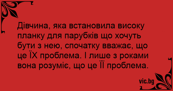 Дівчина, яка встановила високу планку для парубків що хочуть бути з нею, спочатку вважає, що це ЇХ проблема. І лише з роками вона розуміє, що це ЇЇ проблема.