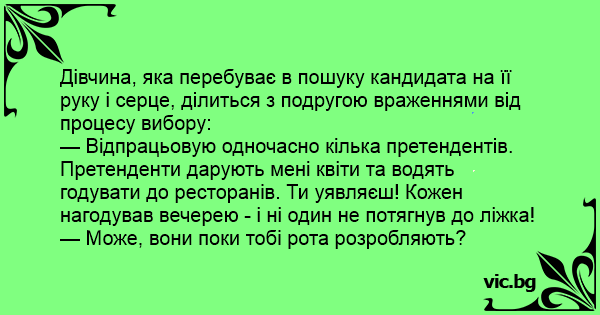 — Відпрацьовую одночасно кілька претендентів. Претенденти дарують мені квіти та водять годувати до ресторанів. Ти уявляєш! Кожен нагодував вечерею - і ні один не потягнув до ліжка!
