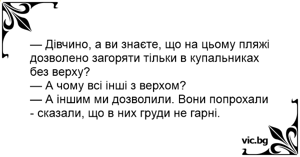 — Дівчино, а ви знаєте, що на цьому пляжі дозволено загоряти тільки в купальниках без верху?