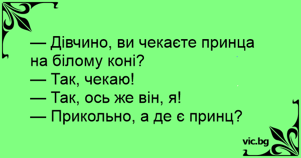 — Дівчина, я знаю, адже ви ж давно чекаєте принца на білому коні? — Так. - Ну от. Я прийшов. — Круто, а де принц?
