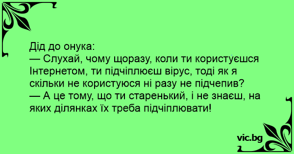 — Слухай, чому щоразу, коли ти користуєшся Інтернетом, ти підчіплюєш вірус, тоді як я скільки не користуюся ні разу не підчепив?