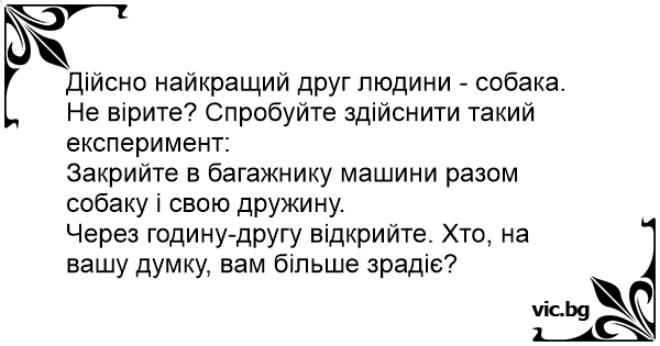 Test de fidelitate: 1. Ia cainele si nevasta si baga-i in portbagaj. 2. Lasa-i acolo 2 ore. 3. Vezi cine se bucura ca te vede!