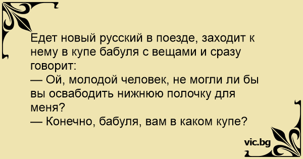 Едет новый русский в поезде, заходит к нему в купе бабуля с вещами и сразу говорит: