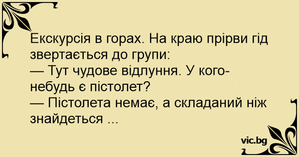 Екскурсія в горах. На краю прірви гід звертається до групи: