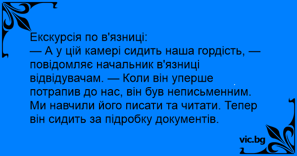 — А у цій камері сидить наша гордість, — повідомляє начальник в'язниці відвідувачам. — Коли він уперше потрапив до нас, він був неписьменним. Ми навчили його писати та читати. Тепер він сидить за підробку документів.