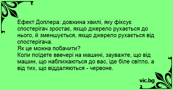 Коли поїдете ввечері на машині, зауважте, що від машин, що наближаються до вас, іде біле світло, а від тих, що віддаляються - червоне.