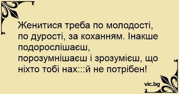 Женитися треба по молодості, по дурості, за коханням. Інакше подорослішаєш, порозумнішаєш і зрозумієш, що ніхто тобі нах:::й не потрібен!