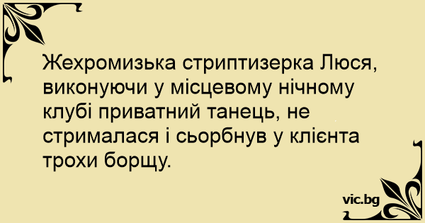 Жехромизька стриптизерка Люся, виконуючи у місцевому нічному клубі приватний танець, не стрималася і сьорбнув у клієнта трохи борщу.