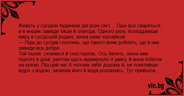 Живуть у сусідніх будинках дві різні сім’ї… Одні все сваряться, а в инших завжди тиша й злагода. Одного разу, позаздривши миру в сусідській родині, жінка каже чоловікові: