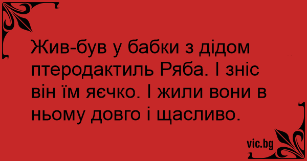 Жив-був у бабки з дідом птеродактиль Ряба. І зніс він їм яєчко. І жили вони в ньому довго і щасливо.