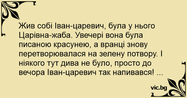 Жив собі Іван-царевич, була у нього Царівна-жаба. Увечері вона була писаною красунею, а вранці знову перетворювалася на зелену потвору. І ніякого тут дива не було, просто до вечора Іван-царевич так напивався! ...