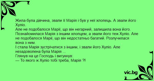 І стала Марія зустрічатися з іншим, і звали його Хуліо. Але незадоволена була Марія ...