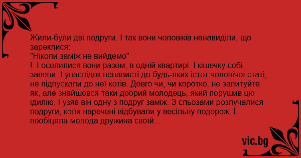 !. І оселилися вони разом, в одній квартирі. І кішечку собі завели. І унаслідок ненависті до будь-яких істот чоловічої статі, не підпускали до неї котів. Довго чи, чи коротко, не запитуйте як, але знайшовся-таки добрий молодець, який порушив цю ідилію. І узяв він одну з подруг заміж. З сльозами розлучалися подруги, коли наречені відбували у весільну подорож. І пообіцяла молода дружина своїй подрузі, що присилатиме їй телеграми аж щодня. І ось проходить день, два, тиждень... а від молодих ні відповіді ні привіту. І ось, тижні через три, подруга, що вкінець перехвилювалася, отримує все ж довгождану телеграму. Розгортає, а там написано: