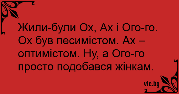 Жили-були Ох, Ах і Ого-го. Ох був песимістом. Ах – оптимістом. Ну, а Ого-го просто подобався жінкам.